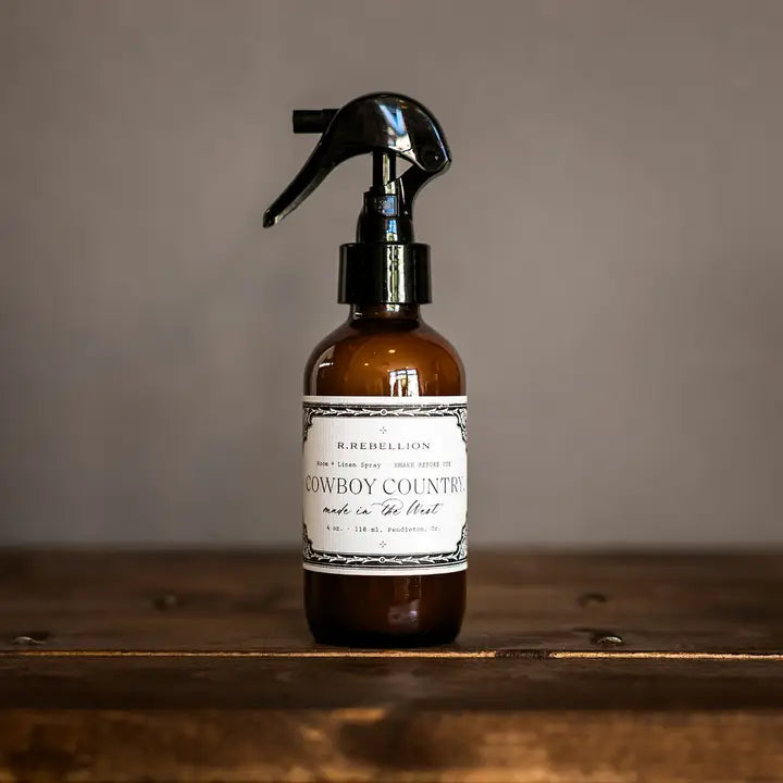 Our Cowboy Country room spray brings notes of aged whiskey, American oak, and warm spices to your bedding, couch, or anywhere you want that rugged, masculine comfort, flame free and oh-so-inviting.