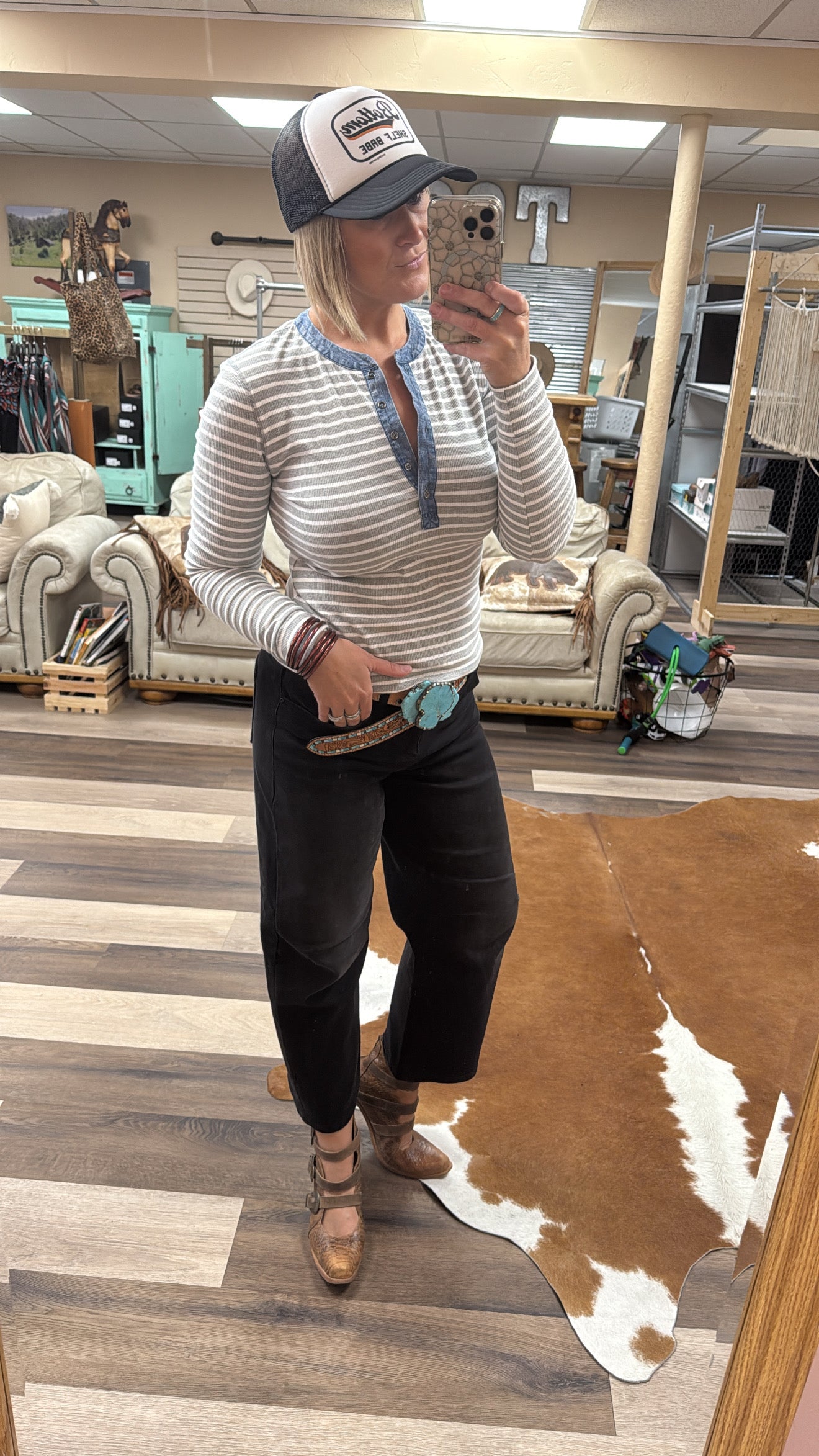 Adorable Heather Grey 3/4 button down long sleeve with white stripes and a denim collar.