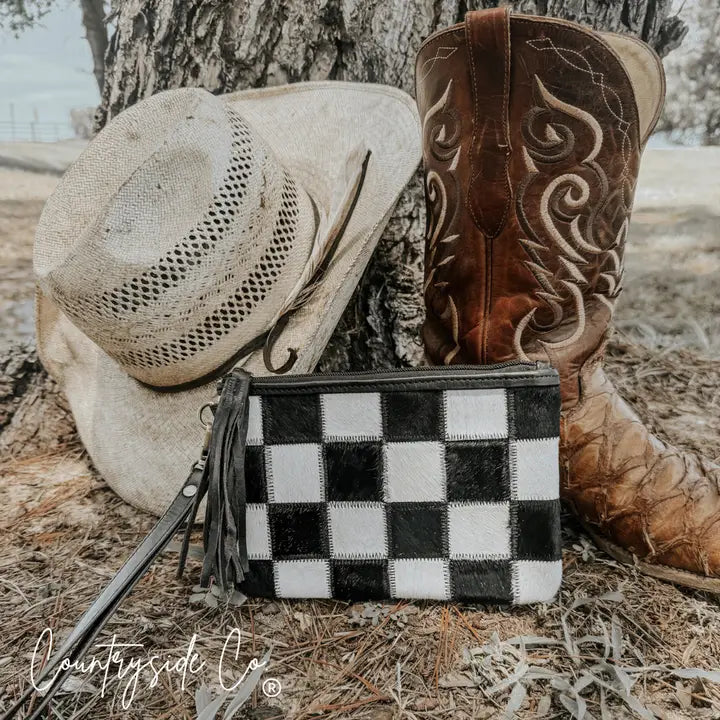 Elevate your accessory game with the Stockdale Checkered Cowhide Wristlet Pouch. Crafted with a striking checkered cowhide front and a smooth leather back, this pouch offers both durability and style. The detachable wristlet provides versatile carrying options, while the leather fringe tassel on the zipper adds a fun touch. Perfect for those who want a functional yet fashionable companion for everyday essentials. Make a statement wherever you go with this unique wristlet. Measures 8 inches by 6 inches Detachable wristlet Inside side zipper pocket